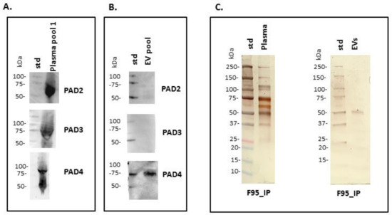 Peptidylarginine deiminase (PAD) isoforms and deiminated proteins in reindeer plasma and plasma EVs. (A) Positive bands identified in reindeer plasma at expected size range of approximately 70–75 kDa using anti-human PAD2-, PAD3- and PAD4-specific antibodies (a pool of five plasma is represented). (B) In plasma EVs, PAD2 and PAD3 isozymes were not detected while a strong positive reaction for PAD4 was observed (EV pool from five animals). (C) F95-enriched IP fractions, representative of deiminated protein enrichment and isolated from reindeer plasma and plasma EVs, were stained with silverstaining following SDS-PAGE in 4–20% TGX gels. The protein size standard (std) is indicated on the blots and gels in kilodaltons (kDa).