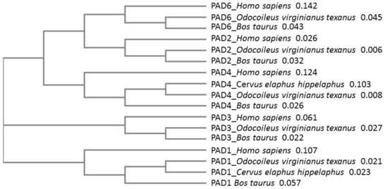 Sequence alignment, followed by neighbor joining tree construction comparing known PAD isozyme sequences from deer (white-tailed deer, red deer) with cattle (Bos taurus) and human (Homo sapiens) PADs, further revealed that deer PAD isozymes align with other mammalian PADs (Figure 3). Based on percent identity matrix (using Clustal Omega 2.1), homology of PAD isozymes from deer (using the protein sequences from Odocoileus virginianus texanus) compared with human PADs was as follows: PAD1 78.88%, PAD2 93.29%, PAD3 87.71%, PAD4 75.97%, and PAD6 71.55%.