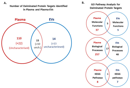 Upon protein network analysis for deimination-enriched proteins in whole plasma and plasma EVs, a number of shared and unique GO molecular function, GO biological processes and KEGG pathways were identified as represented by the Venn diagrams in Figure 4B.