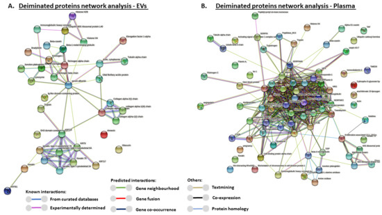 Protein networks of deiminated proteins in plasma EVs were also analyzed for GO biological processes and GO molecular function and STRING protein networks for these processes are provided in Supplementary Figure S1A,B, respectively. Similarly, whole plasma deimination STRING protein networks for GO biological processes and GO molecular function are provided in Supplementary Figure S2A,B respectively.