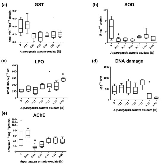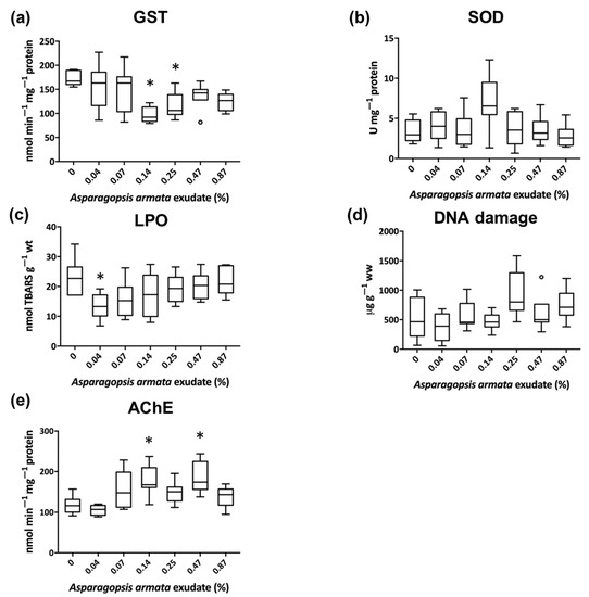 Results of detoxification and antioxidant defenses (a,b), oxidative damage (c,d), in Palaemon elegans’ hepatopancreas tissue and acetylcholinesterase (e) in the eyes, when exposed to Aparagopsis armata exudate for 168 h (n = 8). Results are shown in boxplot (i.e., the median, the first and the third quartiles, and the nonoutliers’ range and the outliers); * Significant differences from the control (Kruskal–Wallis, Nemenyi, p < 0.05).