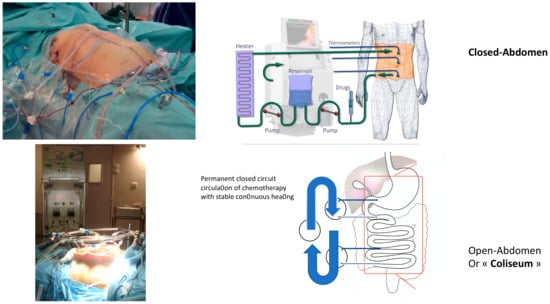 - Leiting, J.L.; Cloyd, J.M.; Ahmed, A.; Fournier, K.; Lee, A.J.; Dessureault, S.; Felder, S.; Veerapong, J.; Baumgartner, J.M.; Clarke, C.; et al. Comparison of open and closed hyperthermic intraperitoneal chemotherapy: Results from the United States hyperthermic intraperitoneal chemotherapy collaborative. World J. Gastrointest. Oncol. 2020, 12, 756–767. [Google Scholar] [CrossRef] [PubMed]