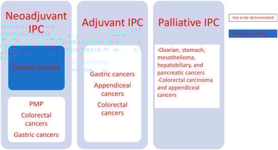 While the main advantage of neoadjuvant IPC is to reduce IP burden, some drawbacks such as fibrosis, adhesions, and more morbidity at the time of cytoreduction can appear [61]. Consequently, prospective studies are required to certify the effectiveness and safety of such a procedure. Several clinical trials are recruiting, especially in colorectal cancers (NCT03253133) and gastric cancers (NCT04308837).