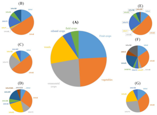 Distribution of phytoplasma groups in different crops, where (A) shows the relative occurrence (%) of phytoplasma diseases according to hosts, while the lateral pies show the relative occurrence (%) of phytoplasma groups on in ornamental crops (B), field crops (C), weeds (D), vegetable crops (E), fruit crops (F), and oilseed crops (G).