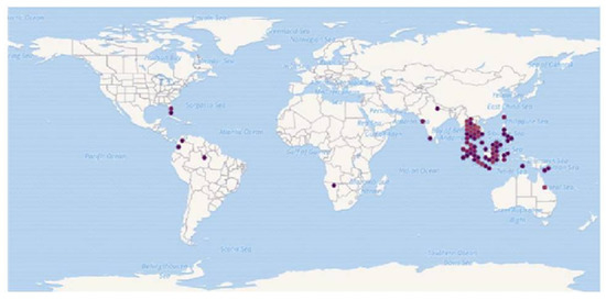 Known global distribution of Trichogaster trichopterus. Locations are in Australia, Papua- New Guinea, Indonesia, Malaysia, the Philippines, Taiwan, Vietnam, Cambodia, Laos, Thailand, Myanmar, India, Namibia, Colombia, Brazil, and the United States. Map from the GBIF Secretariat [11].