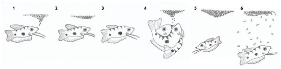 Sexual behavior of male blue gourami during the reproductive cycle. (1) The male builds a nest. (2) and (3) The male courts the female under the nest. (4) Fertilization takes place and the fertilized eggs float up and stick to the bubble nest. (5) The male guards the eggs in the nest. (6) The male further protects the fry immediately after hatching while they swim in the nest area [10,13].