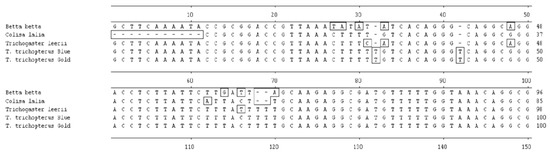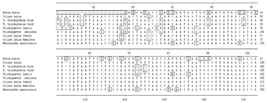 Comparison of the 12S rRNA gene nucleotide sequences (150 bp) in Trichogaster trichopterus (blue gourami and gold gourami), T. leerii (pearl gourami), C. lalia (dwarf gourami), and B. betta (fighting fish) [2].