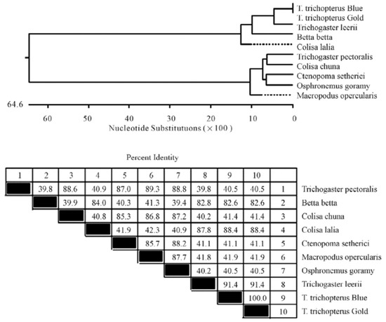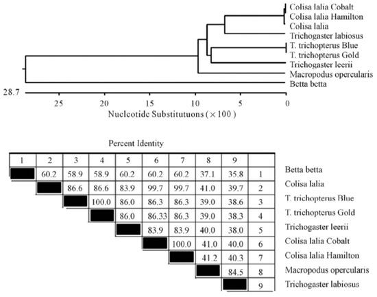 Based on this gene, the most similar species were Trichogaster trichopterus (gold) and Trichogaster trichopterus (blue) (100%). Trichogaster leerii was less similar to these (86.0%), and even lower similarity was found between the species T. trichopterus and Trichogaster labiosus (85.6%). The least similarity was observed between Betta betta and the genera Colisa (50.2%) and Trichogaster (60.1%). The similarity value for the cytochrome b gene of Macropodus opercularis was between that of Betta and Colisa [2]. The phylogenetic tree for cytochrome b is shown in Figure 5 [2].