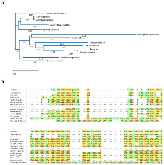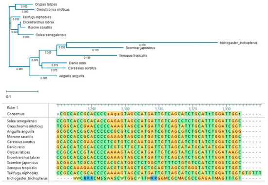 For example, the cytochrome b sequence was used to study genetic variation of the genus Capoeta and specifically the species C. damascina [49,50]. C. damascina is one of the most common freshwater fish species found in a wide range of isolated water bodies throughout the Levant, Mesopotamia, Turkey, and Iran. Prior to these studies, C. damascina was not a well-defined species. Likewise, the COI gene is widely used in assessing genetic variation in both geographical distribution and aquaculture contexts [51,52]. This gene is suitable for the separation of different species belonging to the genus Trichogaster, but not of the order Anabantiformes (Figure 23 and Figure 24).