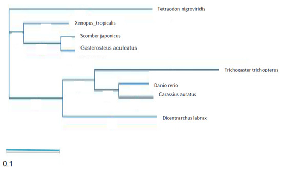 There was a low degree of similarity for both nucleotide and amino acid sequences of Kiss2 between the blue gourami and other fish species (Figure 10). A higher degree of similarity was found between the Kiss2r of blue gourami and those of the other fish species (Figure 11). The results show that Trichogster trichopterus Kiss2r’s amino acids sequence is very different from those of the species Tetraodon nigroviridis, Xenopus tropicalis, Scomber japonicus, and Gasterosteus aculeatus and closer to the species Danio rerio, Carassius auratus, and Dicentrarchus labrax.