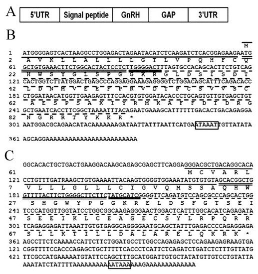 The schematic structure of the prepro GnRH of blue gourami (A); cDNA sequences of GnRH1 (B) and GnRH2 (C). The signal peptide is underlined in black; the GnRH sequence is double-underlined, the cleavage-site position is underlined with a bold black line; the GAP sequence is underlined with a dashed line; and the 3’ poly(a) signal is boxed [31].