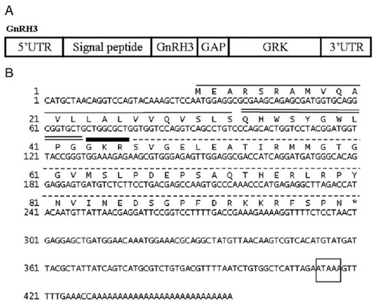 Schematic structure of the Prepro GnRH3 (A) and the cDNA and deduced amino acid sequence of GnRH3 (B) of the blue gourami. The signal peptide is underlined in black; the GnRH3 sequence is double-underlined and the cleavage-site position is underlined with a bold black line; the GAP sequence is underlined with a dashed black line and the 3′ poly(a) signal is boxed [31].