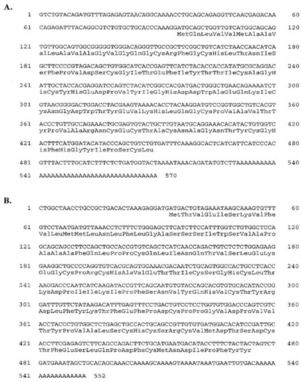 Nucleotide sequences of blue gourami FSH-β (A) and LH-β (B). The amino acid sequence. of each hormone appears in three-letter code. The GenBank accession numbers of these sequences are AF157630 and AF157631, respectively [34].