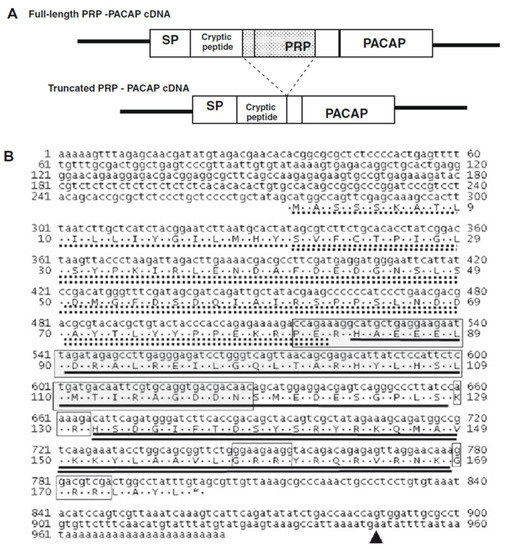 Schematic structures and sequences of PRP–PACAP. (A). Schematic structures of the prepro PRP–PACAP cDNA of blue gourami. (B). cDNA sequence of PRP–PACAP. The signal peptide is underlined with a dashed black line; the cryptic peptide is underlined with a dashed double line; the PRP sequence is underlined in black; the cleavage-site positions are boxed and the PACAP sequence is double-underlined. The gray box designates the deleted region in the PRP–PACAP short form. The triangle denotes the 3’ poly(A) signal ATTAAA [31,33,36].