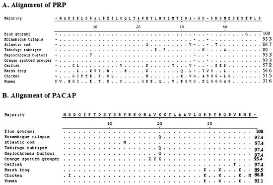 PRP (A) and PACAP (B) amino acid sequence comparison between blue gourami and other vertebrates. The sequence alignment was conducted using ClustalW and the MegAlign program (DNASTAR) on PRP and PACAP mature peptide sequences. Identical amino acids are represented by dots, and differing residues are shown in the single letter code for amino acids. In contrast to PRP, PACAP is highly conserved [36].