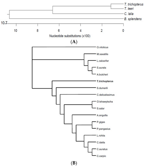 Additionally, sequences of the rRNA 12S gene from T. trichopterus (gold), T. trichopterus (blue), T. leerii, C. lalia, and B. betta are shown in Figure 6, and the nucleotide-similarity phylogenetic tree is presented in Figure 7 [2]. The phylogenetic tree results for the 12S rRNA gene were very similar to those for cytochrome b. 12S rRNA gene sequence similarity between Trichogaster species was high (91.4%–100%), and there was less similarity between this genus and C. lalia (88.4%). In addition, there was less similarity between T. trichopterus and C. lalia than between T. trichopterus and B. betta (82.6% and 84.0%, respectively) [2].