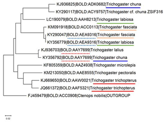 Phylogenetic tree of the COI-5p gene records of the genus Trichogaster. Twelve nucleotide sequences from 8 species were retrieved from BoldSystem [46], such that every species is represented by sequences from unique bins. Tree was constructed using Neighbour-joining method using Kimura 2 Distance Model, with pairwise deletion and MUSCLE alignment in the MEGA-X software [47]. A sequence from the genus Ctenops was used as an outgroup. Leaves are marked with genbank_accession|Bold_bin_id|species. Sequences that belong to the species that appear more than once in the tree are underlined with the same color. Bins that appear more than once are underlined with a dotted line.