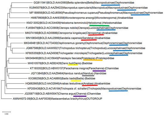 Phylogenetic tree of the COI-5p gene records of the order Anabantiformes. Nineteen nucleotide sequences from different species were retrieved from BoldSystem [46], such that every genus is represented by one sequence. Tree was constructed using Neighbor-joining method using Kimura 2 Distance Model, with pairwise deletion and MUSCLE alignment in the MEGA-X software [47]. A sequence from the species Mastacembelus brachyrhinus that belongs to the order Synbranchiformes was used as an outgroup. Leaves are marked with genbank_accession |Bold_bin_id|species|genus|subfamily|family. Sequences that belong to the same taxonomic family are marked with the same color.