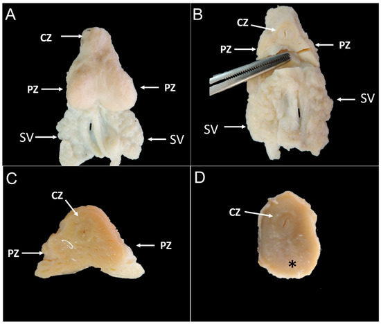 Gross image of adult (A–C) and young (D) giant anteater prostate glands. (A): it is possible to observe a bilobulated gland with a fibrous capsule. (B): transverse section showing a central zone surrounding the prostatic urethra and the two peripheral lobes (peripheral zones). (C): macroscopic appearance of the giant anteater prostate gland at transverse section, with the peripheral zones characterized by the presence of several cavities filled with a gelatinous material, (arrow) (D): transverse section showing a central prostatic urethra surrounded by a central zone and no clear definition of the peripheral zones (asterisk). CZ: central zone; PZ: peripheral zone; SV: seminal vesicle.