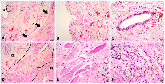 Histological representation of the different prostatic zones. (A): low magnification (5×) of central zone of the prostate gland, showing the prostatic urethra (U) and a high density of blood vessels and ducts. The lined circles represent a higher magnification of the prostatic structures showed in figures B and C. It is also possible to observe a muscle-rich stroma surrounding the central zone (arrows). (B): a high magnification (20×) of the prostatic urethra. (C): a higher magnification of a prostatic duct of the central zone (CZ). (D): a low magnification (5×) of the division of both zones: central zone (CZ) and peripheral zone (PZ). The muscle-rich stroma surrounds the prostatic urethra (in the middle of the dotted lines), dividing the central zone (enriched by ducts) and peripheral zone (enriched by luminal glands). (E): a higher magnification (40×) of the stroma dividing both zones. This region is composed by a muscle-rich stroma. (F): luminal glands from the peripheral zone (in the figure D, showed in the lower left side). Hematoxylin and eosin staining.