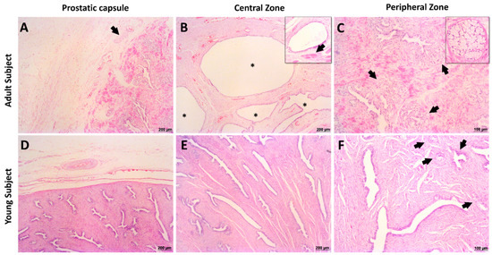 Histological evaluation of giant anteater prostate gland. (A): peripheral region of the prostate gland capsule of an adult subject presenting the peripheral nerves (arrow) and blood vessels. (B): central zone of the adult giant anteater, presenting prostatic ducts (insert) with large lumen (asterisk). (C): peripheral zone showing a central duct surrounded by secretory cells (insert). It is observed a high density of luminal secretory cells (arrows). (D): peripheral region of a young giant anteater capsule showing large caliber blood vessels. (E): central zone of a young giant anteater enriched by ducts with columnar epithelium. (F): peripheral zone of a young giant anteater prostate gland present high caliber ducts and small cluster with secretory cells (arrows). Hematoxylin and eosin staining.