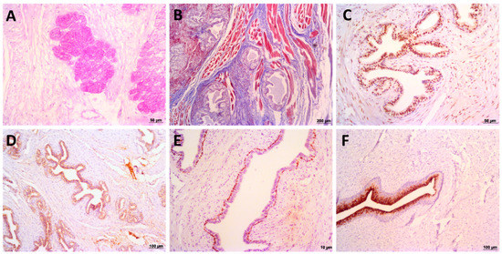 Histochemical and Immunohistochemical analysis of giant anteater prostate gland. (A): luminal cells from peripheral zone presenting PAS-rich secretory cells. (B): Masson’s trichrome stain, presenting muscle fibers staining in red and collagen fibers stained in blue. It is possible to note a fibromuscular stroma in peripheral zone. (C): androgen receptor (AR) nuclear immunoexpression in prostatic epithelial cells. (D): prostatic specific antigen (PSA) staining in prostatic epithelial cells. (E): p63 positive expression by basal prostatic cells. (F): uroplakin III immunoexpression by urothelial superficial cells from prostatic urethra.