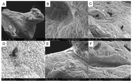 Scanning electronic microscopy. Ultrastructural lower magnification distinguishing the central and peripherals zones (ZC to the central zone and ZP to the peripheral zone, in picture (A). It is possible to visualize the capsule (B), the peripheral zone with the acinus (asterisk) (C), whose epithelium can be observed in higher magnification (D), the urethra prostatic in the central zone (asterisk) (E), surrounded by the prostatic ducts (F).