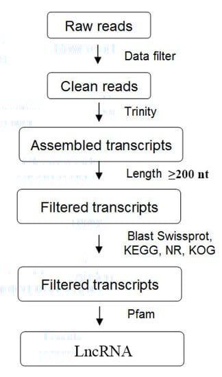 General flowchart of the pipeline used to systematically identify long non-coding RNAs (lncRNAs) in Nicotiana benthamiana infected with Chinese wheat mosaic virus.