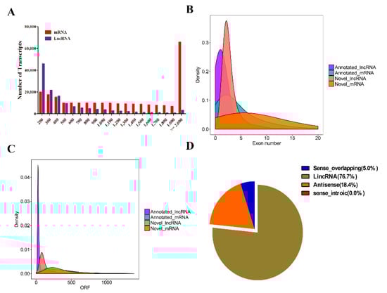 Characteristics of mRNA and lncRNA in Nicotiana benthamiana. (A–C) Num ber of different lengths of lncRNAs and mRNAs in these transcripts, Exon numbers and open reading frame length density characteristics in the identified lncRNAs and mRNAs; (D) different types of lncRNAs were identified in the leaf of N. benthamiana, including intergenic lncRNAs, antisense lncRNAs (lncRNAs with exonic overlap with a known transcript), sense_overlapping lncRNAs (lncRNAs with generic exonic overlap with a known transcript), and sense_introic lncRNAs (lncRNAs with intronic and exon regions of a known transcript).