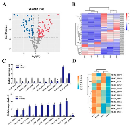 Identified differentially expressed lncRNA responses to Chinese wheat mosaic virus in Nicotiana benthamiana and verification of the expression level of differentially expressed lncRNAs (DElncRNAs) in different tissues by qRT-PCR. (A) Volcano plots were created to distinguish DElncRNAs, Vertical lines indicate 2-fold up- or down-regulation, and horizontal lines represents p = 0.05. Red and blue dots represent up- and down-regulated lncRNAs, respectively. (B) Heatmap was constructed based on expression profile data of DElncRNAs between CK and CWMV infection samples (log2 |fold-change| > 2 and false discovery rate < 0.05), blue and red represent down- and upregulated lncRNAs in different samples, respectively; (C) partial DElncRNAs were verified by qRT-PCR. (D) Expression levels of partial DElncRNAs in different tissues, including root, stem, leaf, and flower, were analyzed by qRT-PCR. Heatmaps were constructed based on the qRT-PCR results, and red and blue colors represent higher and lower expression of lncRNAs in different tissues.