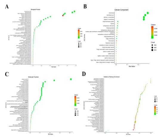 GO and KEGG pathway enrichment analysis of differentially expressed lncRNAs (DElncRNAs) in response to Chinese wheat mosaic virus in Nicotiana benthamiana. To analyze DElncRNAs function, we predicted potential target genes of these DElncRNAs and evaluated them by GO and KEGG pathway analysis. These potential target genes were individually enriched into biological processes (A), cellular components (B), molecular function (C), and KEGG pathway (D). The Rich factor is the ratio of differentially expressed gene numbers annotated in this pathway term to all gene numbers annotated in this pathway term. The Q-value is a corrected p-value ranging from 0 to 1, with lower values indicating greater intensiveness. The circle represented the number of enriched genes, with a larger number indicating more enriched genes.