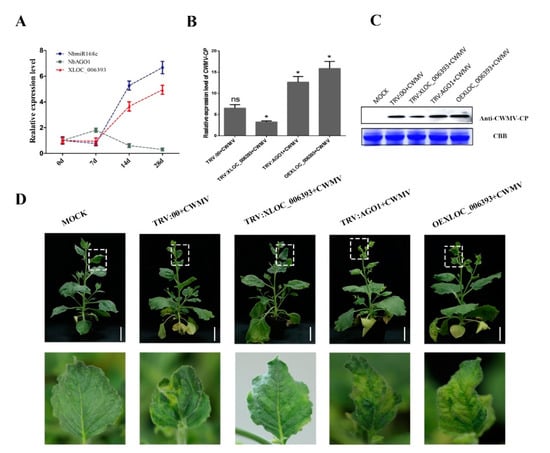 Validation of XLOC_006393 by virus-induced gene silencing. (A) The expression levels of XLOC_006393, NbmiR168c, and NbAGO1 were analyzed at different time points (0, 7, 14, and 28 days) after CWMV infection; (B,C) accumulation of CWMV CP was detected in different plant materials, including TRV:NbmiR168c, TRV:NbAGO1, TRV:XLOC_006393, and TRV:00 by qRT-PCR and Western blotting (WB), of which coomassie brilliant blue (CBB) was used to calculate the protein content of different samples—full WB images in Figures S2 and S3. * and ns showed significant and no significant differences between the two samples, respectively; (D) mild green mosaic lesions formed successively in the leaves of different plant materials after 30 days of CWMV infection. Bottom photograph is an enlargement of the boxed part of (D). These plant materials contained Mock, TRV:00, TRV:XLOC_006393, TRV:NbAGO1, and OEXLOC_006393.