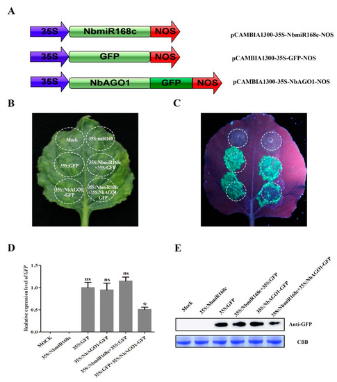 NbmiR168c regulates NbAGO1 expression by a post-transcriptional process in vivo. (A) Construction of NbAGO1-GFP fusion expression vector and NbmiR168c expression vector; (B,C) GFP fluorescence intensity of infiltrated sites of the leaf with different vectors; (D,E) accumulation of GFP was detected in different Nicotiana benthamiana leaves after 48 h of transient infection with different vectors by qRT-PCR and Western blotting—full WB images in Figures S4 and S5. * and ns showed significant and no significant differences between the two samples, respectively.