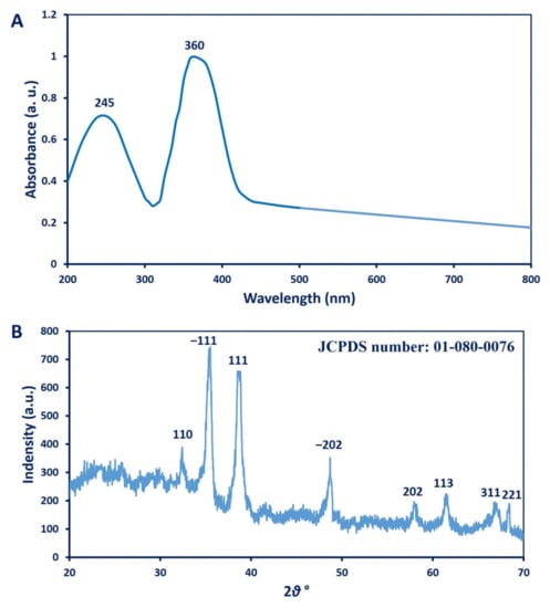 A. niger-mediated biosynthesis of CuO-NPs was confirmed by UV–vis spectroscopic analysis, which showed two peaks. The first peak was related to cuprous oxide (Cu2O) at 245 nm, and the second was for cupric oxide (CuO) at 360 nm (Figure 1A). Data in this study are compatible with Rabiee et al. [39], who reported that the UV–vis spectra of CuO-NPs synthesized by Achillea millefolium leaf extract also had two peaks, with one at 250 nm for cuprous oxide and one at 365 nm for cupric oxide. In contrast, Yin et al. [40] showed that the UV–vis spectrum of CuO nanocrystals has three absorption peaks at 260 nm, 340 nm, and 630 nm. He reported that the observed peaks at 260 nm and 340 nm were due to the band-to-band transition of Cu2O nanocrystalline, while the peak at 630 nm was attributed to the bandgap transition of CuO. Moreover, the UV–vis spectrum of CuO-NPs fabricated by aqueous extract of brown algae Bifurcaria bifurcata showed two absorption bands at 260 nm and 650 nm, corresponding to the formation of Cu2O and CuO, respectively [41]. The results of the current study indicate the successful formation of Cu2O and CuO in the colloidal NP solution, which conforms with the various published studies [39,42], and this finding was confirmed by XPS analysis. These characteristic patterns of as-formed CuO-NPs were due to the efficacy of water-soluble metabolites present in the biomass filtrate to reduce copper ions [41]. The broadest peaks in UV–vis spectra could be due to the broad size distribution of CuO-NPs [39]. The color change was correlated with the surface plasmon resonance (SPR) of formed NPs, which confirms the efficacy of metabolites involved in A. niger biomass to reduce metal Cu+2 to the nanoscale [43,44].
