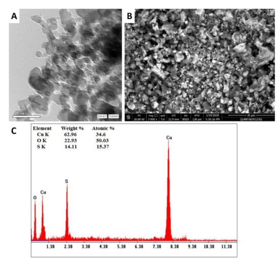 Characterization of CuO-NPs synthesized by A. niger G3-1; (A) transmission electron microscopy (TEM); (B) and (C) denote SEM-EDX spectra of biosynthesized CuO-NPs.