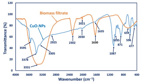 The functional groups responsible for reducing and stabilizing CuO-NPs, as well as those found in NPs, were characterized using FT-IR analysis. As seen in Figure 3, fungal biomass filtrate had varied peaks at 659, 1630, 2302, and 3331 cm−1. The broad absorption peaks at 3331 and 1630 cm−1 corresponded to N-H vibration bending amine and stretching C=C conjugated alkene, respectively [47]. A strong broad peak at 659 cm−1 referred to the C=C bending of alkene, while the peak at 2302 cm−1 corresponded to the stretching of the S-H thiol group in proteins [53]; meanwhile, IR of the biogenic CuO-NPs showed different peaks at 3595 cm−1 (O-H stretching, alcohol), 3378 cm−1, and 3305 cm−1 (N-H stretching, aliphatic primary amines, and O-H broad stretching alcohol, respectively) [54,55]. Other IR CuO-NPs peaks appeared at 2925 cm−1 (C-H stretching, medium, alkane), 2030 cm−1 (C=C=C, stretching, medium, allene), 1635 cm−1 (C=C, medium, alkene), 1087 cm−1 (strong C-O stretching, secondary alcohol), 1035 cm−1 (medium C-N, amine), and 871 cm−1 (strong C-H bending) [56,57]. Interestingly, the IR peaks at 477 and 596 cm−1 corresponded to the formation of metal oxide (Cu-O) [47,58]. The presence of functional groups in the biomass filtrate displayed by the FT-IR spectra could be responsible for reducing, capping, and stabilizing the biogenic CuO-NPs.