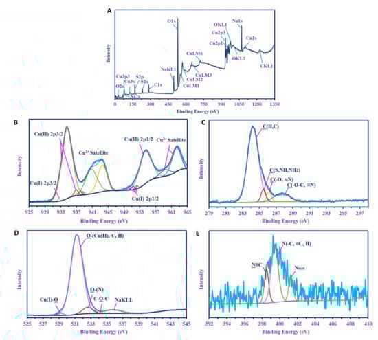 XPS analysis of CuO-NPs synthesized by A. niger strain G3-1. (A) Overall survey; (B) core CuO-NPs; (C–E) C 1s, O 1s, N 1s, respectively, of CuO-NPs.