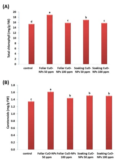 Leaf pigments were also observed (Figure 5A,B). The results showed significant increases in the total chlorophylls and carotenoids in response to all treatments of CuO-NPs. At 50 ppm, the highest significant increases in total chlorophylls (23% and 10.5%) and carotenoids (20.2% and 12.3%) were observed. In a recent study by [83], lower concentrations of CuO-NPs showed increased leaf pigments (chlorophylls and carotenoids) in tomato plants (Lycioersicum esculentum). Moreover, lower concentrations of CuO-NPs stimulated photosynthesis up to 14%, as compared with the control level of tomato plants [82]. This increase in photosynthesis rate might be due to the increased biological and chemical activities of metals at the nanoscale and the correlative impact of nutrients (magnesium, iron, zinc, sulfur, etc.) on plants. Young [89] indicated that the promotion of carotenoids plays a significant role in scavenging ROS and protects the plant from the predicted stress. Metal NPs can also enhance the structure of chlorophyll and facilitate the formation of pigments and metabolic activities [90,91,92]. It has been noted that copper is a microelement needed in small quantities for normal plant growth, due to it being a structural element in regulatory proteins, an activator of several enzymatic reactions, and a participant in the photosynthetic electron transport chain [93].