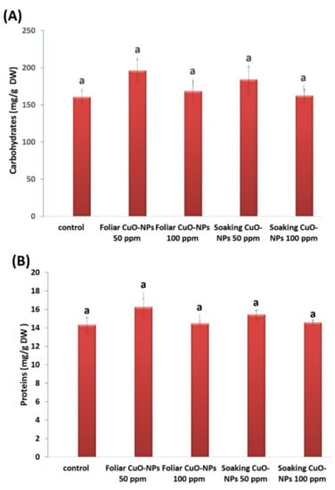 The carbohydrate and protein contents of wheat plants were also assessed (Figure 6A,B). Non-significant increases were found in response to the foliar or soaking treatments of CuO-NPs at 50 and 100 ppm. The foliar treatment at 50 ppm recorded the highest increase in carbohydrate (21%) and protein (13%) contents as compared to the control. Carbohydrate and protein contents were reduced with increased CuO-NP concentrations (100 ppm) but did not decline below the control level. It is well noted that Cu ions in small concentrations can stimulate plant growth due to its role as an essential crop micronutrient [94,95], its direct participation in redox enzymes, and its involvement in chlorophyll synthesis and protein and carbohydrate metabolism [96]. Our findings are in line with the investigation of Singh et al. [82] on tomato plants, who found that a lower concentration of CuO-NPs (10 mg·L−1) exhibited an increase (7%) in carbohydrate content. Additionally, Ochoa et al. [97] observed non-significant increases in the protein contents of green pea (Pisum sativum) plants after adding 50 and 100 mg/kg soil of CuO-NPs. Wheat plants subjected to CuO-NPs in concentrations ranging from 0.2 ppm to 1.0 ppm exhibited significant increases in different agronomic attributes [98].