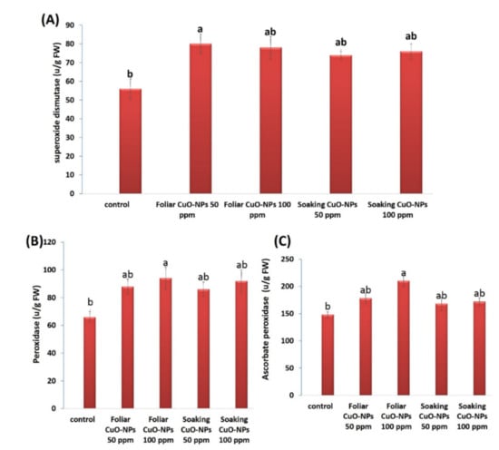 The activities of antioxidant enzymes were influenced in wheat plants exposed to 50 or 100 ppm of CuO-NPs for both application methods (Figure 7A–C). All tested concentrations of CuO-NPs caused improvements in the levels of superoxide dismutase (SOD), peroxidase (POD), and ascorbate peroxidase (APX). The most significant enhancements were recorded for the foliar treatment with CuO-NPs at 50 ppm in SOD activity (approximately 42.9%) and the foliar treatment with CuO-NPs at 100 ppm in POD and APX activities (approximately 42.4% and 41.9%, respectively). Our results are in harmony with several investigations that showed the promotional role of CuO-NPs in antioxidant enzymes [82,83,99]. In some previous studies, APX and POD activities were found to be increased because of CuO-NP application [100,101]. Recent results from Sarkar et al. [102] demonstrated that APX and SOD activities were increased in lentil (Lens culinaris) plants treated with different concentrations of CuO-NPs (0.01, 0.025, and 0.05 mg·mL−1). Copper, an important micronutrient, participates in several physiological and biochemical processes, is required as an activator for superoxide dismutase [103], and is integrated into various enzymes, and it thus has a critical role in plant growth and nutrition [98]. The increased activities of antioxidant enzymes displayed a protective role against oxidative damage in plants.