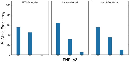 The methodology for determination of PNPLA3 SNPs, and its validation have been previously described [9]. Briefly, PBMCs (peripheral blood mononuclear cells) from the study participants were isolated from peripheral blood collected in CPTs (cell preparation tubes) (Becton Dickinson Co., Franklin Lakes, NJ, USA), according to the manufacturer’s directions. Cells were stored at −80 °C until genomic DNA extraction using a Qiagen QIAamp DNA Blood Mini kit. A Bio-Rad CFX96 thermocycler was used for real-time PCR, amplifying region 43928824-43928869 located on chromosome 22. The amplicon products are subjected to heat shifts to produce a high-resolution melting curve. Using this method, three genotypes of rs738409 can be detected representing CC, CG, or GG SNPs. The CC SNP is wildtype and the GG SNP represents the variant allele of interest. CG is a heterozygotic blend.