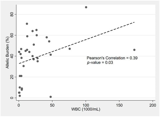 The Sanz risk status significantly correlated with allelic burden according to one-way ANOVA (F(2, 30) = 12.1, p < 0.0001). According to post hoc Scheffe tests, the allelic burden differed between HR/IR (p = 0.007) and HR/LR (p = 0.001), but not in IR/LR (p = 0.32). These findings persisted when adjusting for center, age, gender, ethnicity, WBC, and platelets via linear regression. HR APL was associated with a 38.5% increased allelic burden compared with LR APL (95% CI: 19.8–57.2; p < 0.001). According to Spearman’s Rho, the FLT3-ITD allelic burden was associated with higher WBCs (rs = 0.49, p = 0.03). For every 1% increase in allelic burden, the WBC increased by 0.6 × 109/L. The relationship between the FLT3-ITD allelic burden and WBC can be visualized in Figure 1. Of note, the majority of the reported allelic ratios (33/59 patients) were from those seen after 2012. There was no significant relationship between the FLT3-ITD allelic burden and OS (p = 0.97).