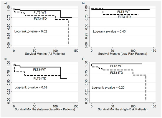 Kaplan–Meier survival curves comparing OS between (a) all patients: FLT3-ITD vs. FLT3-WT, (b) FLT3-ITD/Sanz LR vs. FLT3-WT/Sanz LR, (c) FLT3-ITD/Sanz IR vs. FLT3-WT/Sanz IR, and (d) FLT3-ITD/Sanz HR vs. FLT3-WT/Sanz HR.
