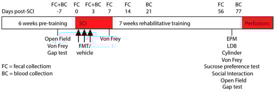 - Schmidt, E.K.A.; Torres-Espin, A.; Raposo, P.J.F.; Madsen, K.L.; Kigerl, K.A.; Popovich, P.G.; Fenrich, K.K.; Fouad, K. Fecal transplant prevents gut dysbiosis and anxiety-like behaviour after spinal cord injury in rats. PLoS ONE 2020, 15, e0226128. [Google Scholar] [CrossRef] [PubMed]