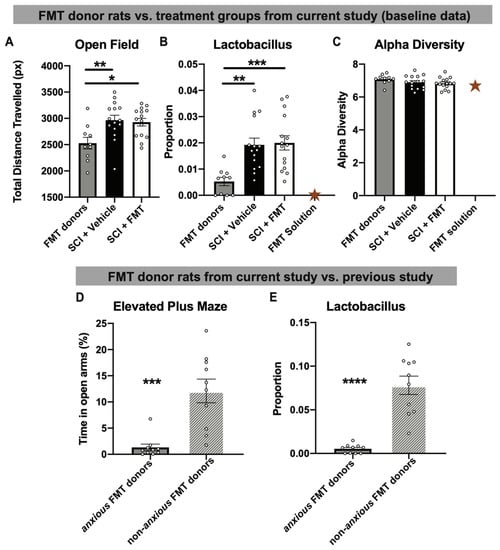 Although the rats used in the present experiment are genetically identical siblings, there is a natural variability in their baseline levels of anxiety-like behaviour, which can be further influenced by environmental stressors. To determine how important optimal donor selection is, the two cages of rats who naturally displayed decreased baseline activity in the open field (as an indicator of anxiety-like behaviour [31,32]) were chosen as the FMT donors. Compared to SCI + vehicle and SCI + FMT groups at baseline (prior to SCI), FMT donors travelled significantly less distance in the open field (p = 0.0052) (Figure 2A). This altered behavioural phenotype was associated with significantly reduced levels of Lactobacillus in the FMT donor’s stool compared to the experimental groups (SCI + Vehicle and SCI + FMT) at baseline (p = 0.0006) (Figure 2B). Reflecting the lack of Lactobacillus in the donor stool, the FMT solution also contained a lack of Lactobacillus (Figure 2B). FMT donors displayed a similar alpha diversity (the bacterial variance within the samples) as the experimental groups, which was also reflected in the FMT solution (Figure 2C). Compared to previously successful FMT donors (which, when transferred to rats after SCI, prevented both SCI-induced dysbiosis and anxiety-like behaviour [2]), anxious FMT donors spent significantly less time in the open arms of the elevated plus maze, confirming their increased anxiety-like phenotype (p = 0.0002) (Figure 2D). The robustness of behaviour in the elevated plus maze of non-anxious uninjured rats throughout different cohorts of animals is shown in Supplementary Figure S1. Not only did anxious FMT donors spend significantly less time in the open arms compared to previous non-anxious donors, they also displayed significant increased anxiety-like behaviour compared to two separate groups (from different experiments) of uninjured animals run in the elevated plus maze (p = 0.0006). Anxious FMT donors also displayed significantly lower proportions of Lactobacillus compared to the non-anxious FMT donors described in our previous study (p < 0.0001; [2]) (Figure 2E). These data suggest that, although the FMT donors were uninjured and had a diverse microbiota composition, they had an increased anxiety-like phenotype and reduced proportion of the genus Lactobacillus, a commonly prescribed probiotic [33,34,35].