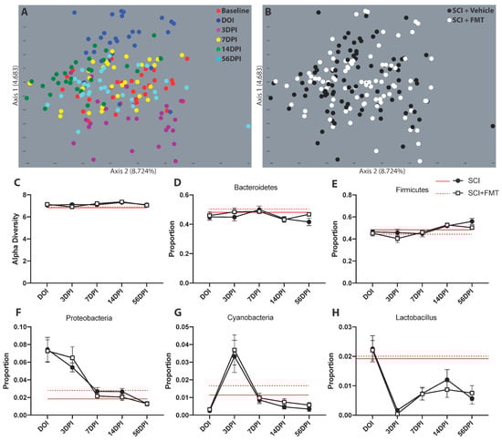 Fecal samples were collected prior to injury, on the day of injury, then 3, 7, 14 and 56 days after SCI for 16S rRNA sequencing. The differences in microbial abundance between the fecal samples was visualized using beta diversity plots. On the day of injury, 3- and 14-days post-SCI there was a deviation in the samples away from baseline values, confirming our previous results that a cervical SCI induces acute dysbiosis. At 7- and 56-days post-SCI, the samples clustered closely with baseline values (Figure 3A). When looking at the beta diversity of the two treatment groups across all time points, there was no difference between FMT or vehicle treated groups (Figure 3B). Although SCI resulted in acute dysbiosis visualized in the beta diversity plots, there was no significant effect of injury or FMT on the alpha diversity (which does not necessarily correlate with changes of individual bacteria; Figure 3C). Next, we looked at the four most abundant bacteria at the Phylum level: Bacteroidetes, Firmicutes, Cyanobacteria and Proteobacteria. There was no effect of SCI or FMT in the proportion of Bacteroidetes or Firmicutes (Figure 3D,E). The proportion of Proteobacteria was increased on the day of injury and 3 days post injury (Figure 3F) and the proportion of Cyanobacteria was increased 3 days post-SCI (p < 0.0001 for both) (Figure 3G), however there were no significant effects of FMT treatment. The proportion of the genus Lactobacillus, a common bacteria present in probiotics [34], was reduced chronically after SCI in both FMT treated and untreated groups (p < 0.0001) (Figure 3H). There was no significant difference between groups in any bacteria at the genus level (Supplementary Figures S2 and S3). These results indicate that the FMT from anxious donor rats was not successful in preventing SCI-induced dysbiosis.