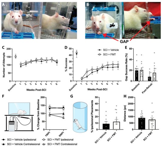FMT from anxious rats did not significantly affect motor recovery following spinal cord injury. (A) Image of a rat in the regular single pellet grasping apparatus, reaching through a narrow opening for a food pellet. (B) Image of a rat reaching in the single pellet grasping apparatus that has been modified to include a gap between the pellet and the opening of the chamber (to eliminate compensatory pellet scooping behaviour). (C) There was no difference between FMT and vehicle groups in the number of attempts or (D) the success rate in rehabilitative training. (E) The success rate in the modified gap task was measured once at baseline and again at the end of the rehabilitation period. There were no significant differences between FMT and vehicle treated groups in the von frey test (quantified as the force required to elicit a withdrawal response, expressed as a percentage of baseline values) (F) the cylinder test (G) or the distance travelled in the open field (H). Error bars represent standard error mean.