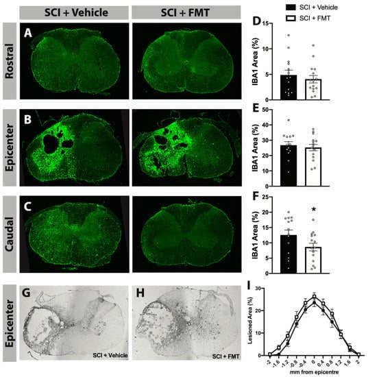 FMT from anxious donors reduced the area of IBA1+ cells caudal to the injury. Representative images of IBA1+ positive cells in the cervical spinal cord immediately rostral to the injury (A), at the injury epicenter (B) and immediately caudal to the injury (C). The percentage of IBA1+ area per spinal cord cross section rostral to, at and caudal to the lesion is quantified in (D–F), respectively. Immediately caudal to the injury, SCI + FMT rats displayed significantly reduced IBA1+ area compared to vehicle controls. Representative cross sections of the maximum injury site for SCI + Vehicle and SCI + FMT groups are shown in (G,H), respectively. (I) Quantification of the rostral (negative measurements) to caudal (positive measurements) extension of the lesion area was expressed as a percentage of lesioned tissue. * p < 0.05. Error bars represent standard error mean.
