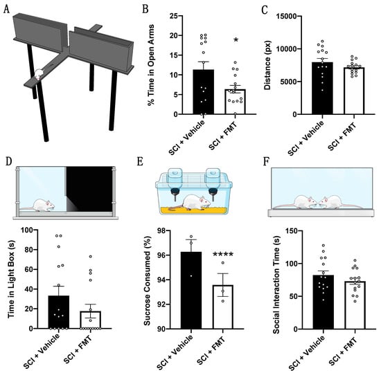At the end of rehabilitative training, rats were tested for depressive- and anxiety-like behaviours. Rats that received an FMT from anxious donors spent significantly less time in the open arms of the elevated plus maze (p = 0.0341), although both groups travelled a similar total distance (Figure 6A–C). The magnitude of differences between groups in the open arms is less than that observed between anxious and non-anxious FMT donors (Figure 2D). Furthermore, SCI + vehicle rats displayed less anxiety-like behaviour than untreated SCI control rats in our previous study [2], which may be due to the daily rehabilitative training received in the present study. There was also a trend for the SCI + FMT group to spend less time in the light component of the light-dark box (Figure 6D) and they drank significantly less sucrose solution (p < 0.0001) (Figure 6E) compared to vehicle controls. Both FMT and vehicle groups spent a similar amount of time interacting in the social interaction test (Figure 6F).