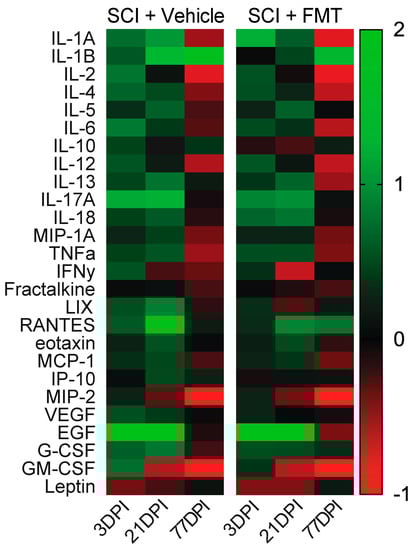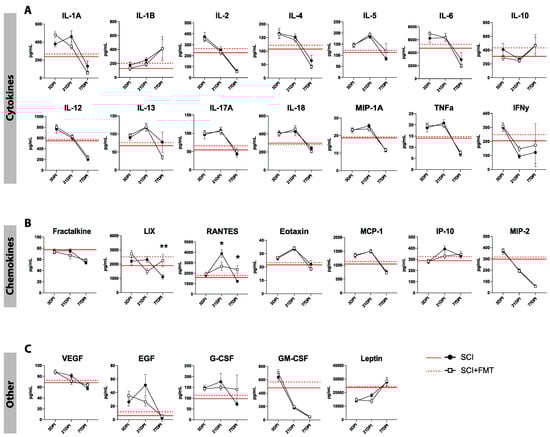 SCI induced time-dependent changes in plasma cytokines and chemokines. (A) Temporal profile of plasma cytokines 3 days post injury (3DPI), 21 days post injury (21DPI) and days post injury (77DPI) for SCI + Vehicle and SCI + FMT groups. (B) Temporal profile of plasma chemokines show that SCI + FMT rats have significantly increased levels of LIX and RANTES at 77 days compared to vehicle controls. (C) Profile of other plasma markers (growth factors, glycoproteins and hormones) over time after injury. Red lines represent baseline values. * p < 0.05. ** p < 0.01. Error bars represent standard error mean.